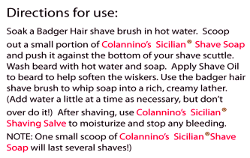 DIRECTIONS FOR USE: 1) Soak a badger-hair shavebrush in hot water. 2) Scoop a small amount of Colannino's Sicilian® Super Creamed Shave Soap and push it into the bottom of your shave scuttle or bowl. 3) Wash beard with hot water and soap. 4) Apply a few drops of Colannino's Sicilian® Shave Oil to your face if you wish, to help soften the whiskers even further. 5) Use the badger-hair shavebrush to whip the soap into a rich, creamy lather. (Add water a little at a time as necessary, but don't overdo it!) 6) Shave with your favorite razor. After shaving, be sure to use some Colannino's Sicilian® Shaving Salve rather than aftershave to keep your skin moisturized all day and smell great, too!
